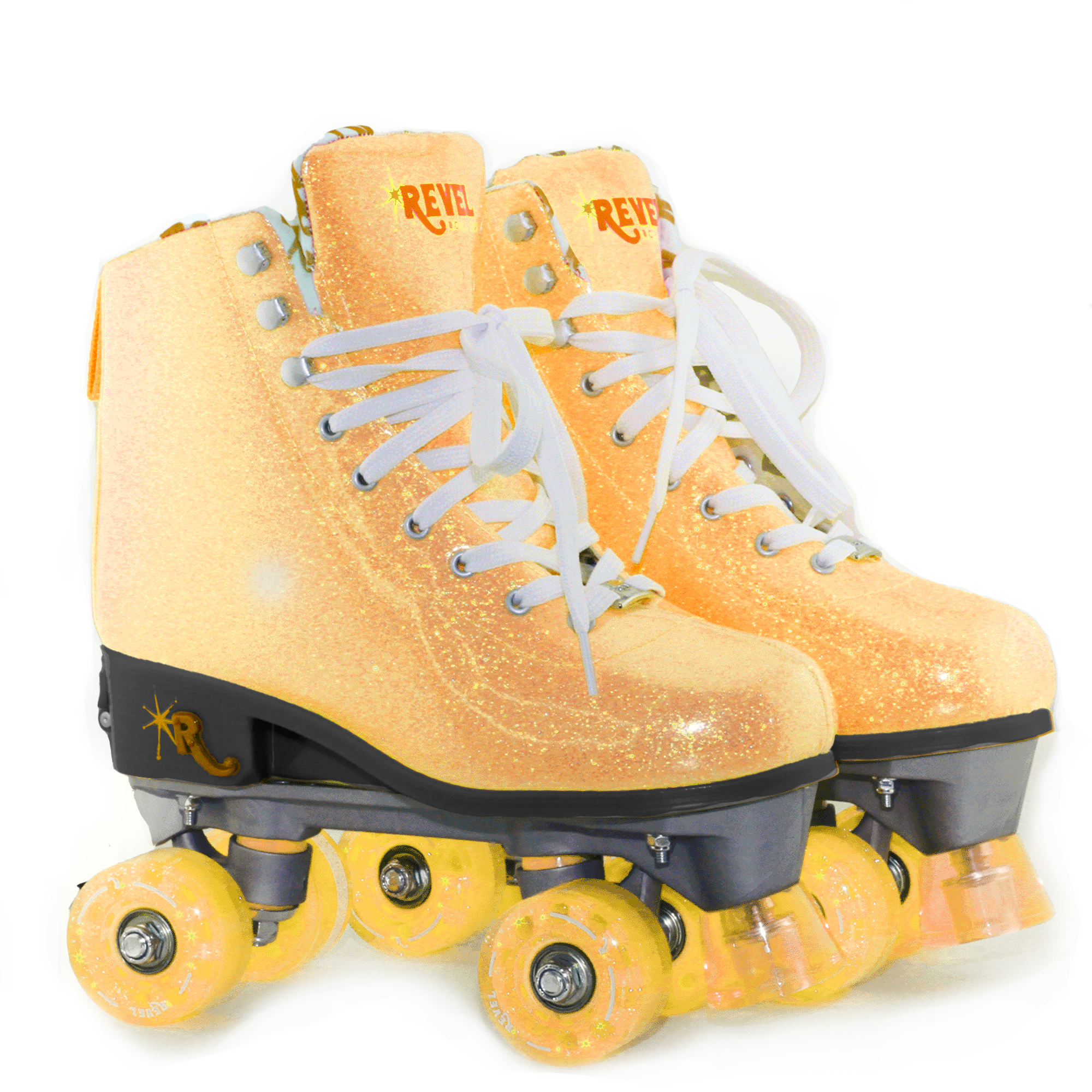 Vibe like it's the 1970s with the Revel Adults' Golden Glitz Quad Skates. The PVC uppers afford durability, while neoprene padded collars offer comfort. Lace closures provide a secure fit, and 54-millimeter nylon core urethane wheels with ABEC 7 bearings deliver a smooth ride.